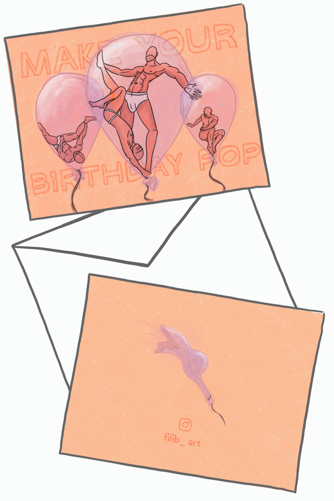 Autorskie kartki okolicznościowe – dobre na każdą okazję, a jeśli akurat nie ma okazji, to też się nadadzą. Powstały z połączenia inspiracji queerową kulturą i klimatem tradycyjnych kartek Hallmarku. Z przodu i z tyłu umieściłem autorskie grafiki, a w środku zostawiłem puste pole – na życzenia, wyznania i wszelką radosną twórczość. Wydrukowane na pięknym, ciepłym beżowym papierze i uzupełnione ekologicznymi kopertami (częściowo wytworzonymi z odpadów po przetwarzaniu migdałów), będą oryginalnym i wyjątkowym upominkiem dla bliskiej Ci osoby.
